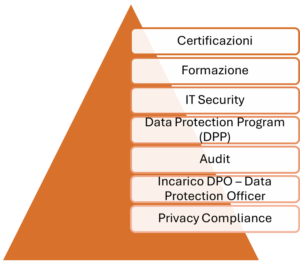 Questa struttura mette in evidenza le priorità: compliance come base, sicurezza per garantire continuità e valorizzazione per crescere e distinguersi sul mercato.